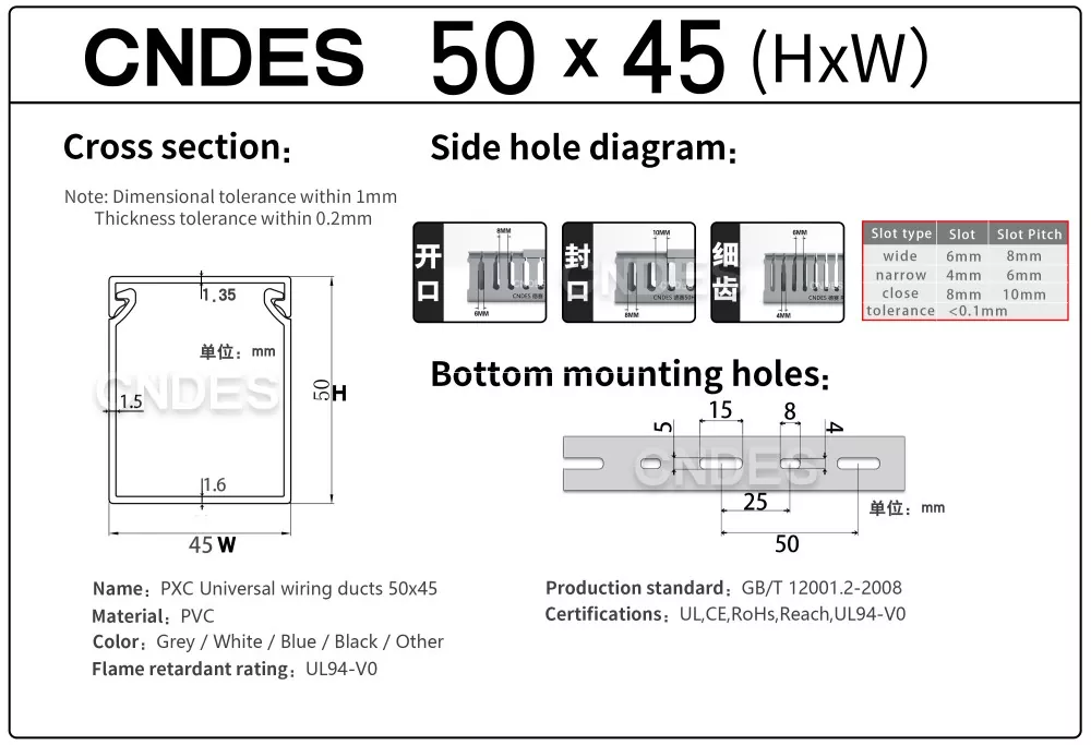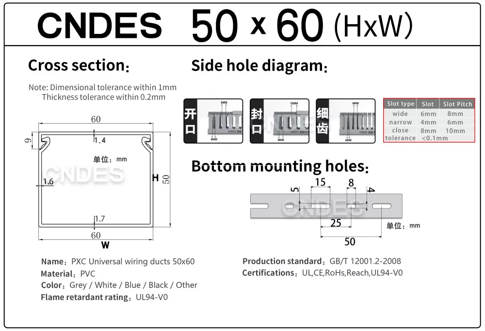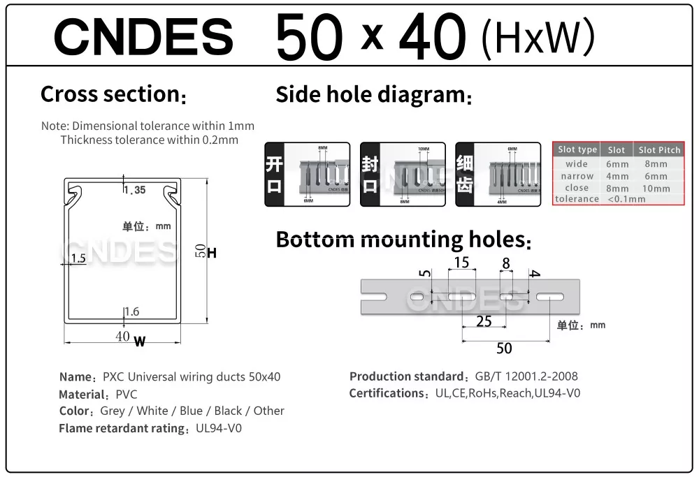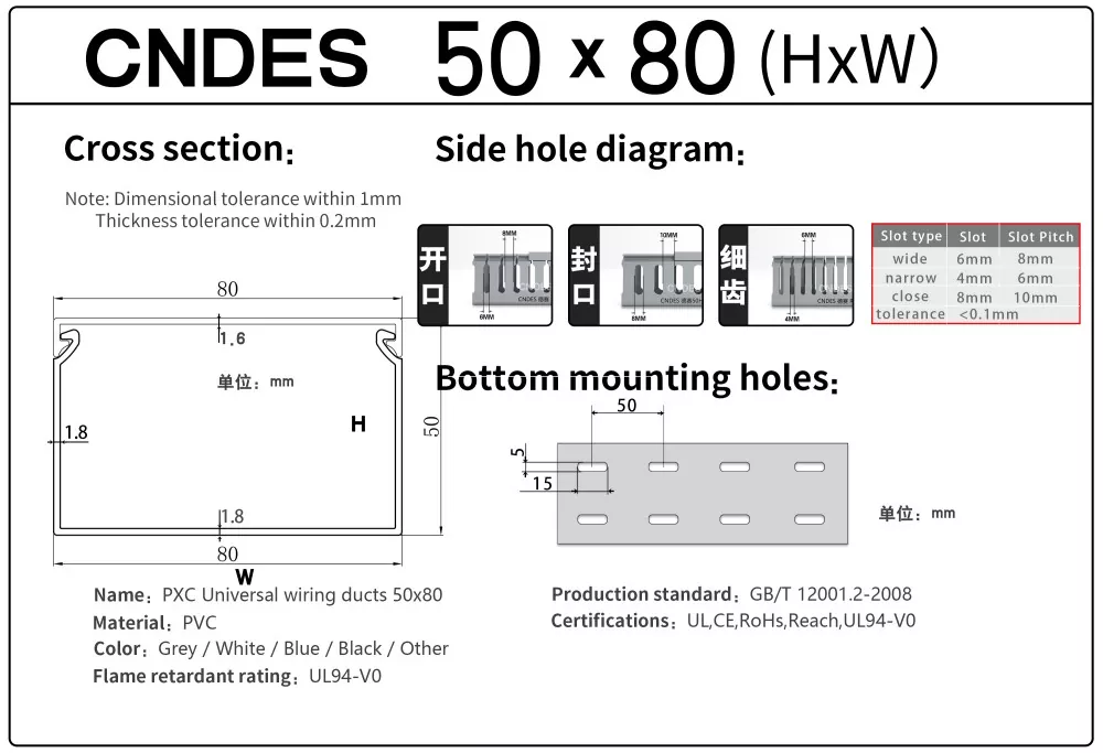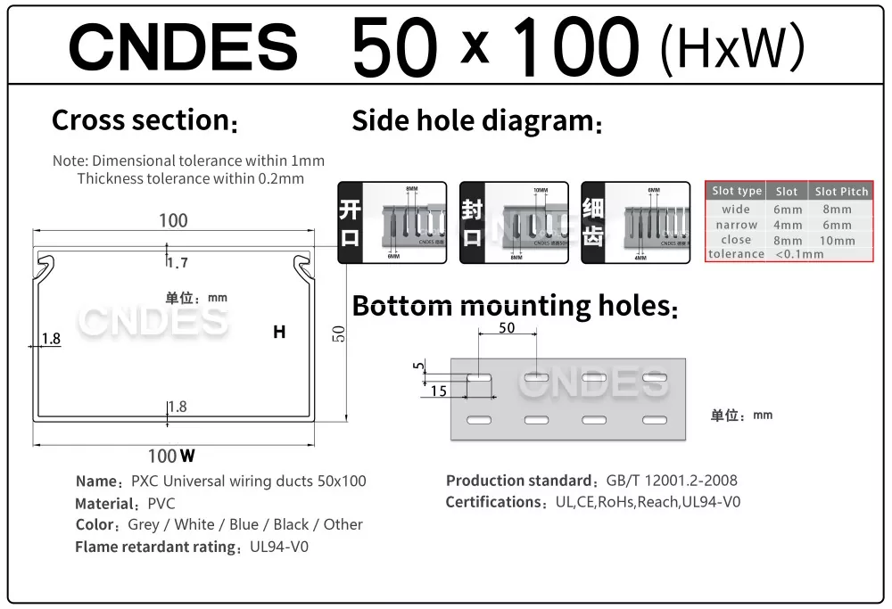 Kabel kanalı qeydləri üçün spesifikasiya: Yan çuxur növü, alt dəlik növü, məhsul qalınlığı və s.