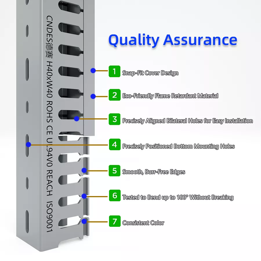 CNDES Çində etibarlı PVC kabel tray istehsalçısı və təchizatçısıdır. Biz sabit məhsul keyfiyyətini, dəqiq yuva aralığını və həm yerli, həm də beynəlxalq layihələr üçün uyğun olan UL, CE, RoHS və REACH standartlarına uyğunluğu təmin edirik.